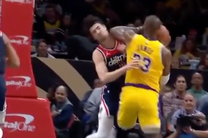 2024年4月,湖人客场挑战奇才,詹姆斯转身肘到阿夫迪亚脑袋,从进攻犯规升级一级恶意犯规。