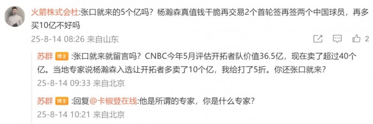 苏群反驳:"CNBC五月估值36.5亿,现成交超40亿。当地专家认为杨瀚森带来10亿增值,我已保守估算。请核实再发言。"