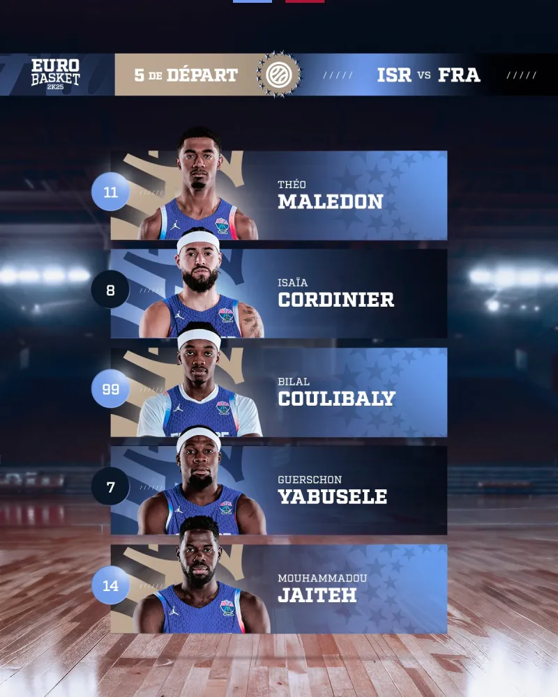 虎扑08月31日讯 今日法国男篮官方更新社媒,公布了对阵以色列的首发名单。